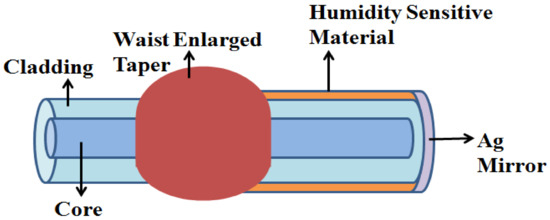 Another method of monitoring humidity is through the phase difference formed due to change in length of the cavity and Refractive Index(RI) called interferometric method [194]. Michelson Interferometer was realized with waist enlarged taper for humidity sensing with the sensitivity of 135 pm/%RH is shown in Figure 7 [195].