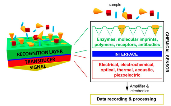 Scheme of a chemical sensor consisting of a recognition layer, an interface, a transducer, and a signal detection element.