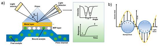 Transducers based on SPR use the change in thickness and the refractive index of thin films coupled to metal surfaces to generate an analytical signal upon binding. The metal surfaces supporting surface plasmons are typically gold and silver, but copper, titanium, and chromium are suitable alternatives. Surface plasmons represent an optical excitation effect based on the theory of attenuated total reflection originally developed by Kretschmann and Raether [123] and Otto [124] that is widely used in sensors. Polarized light is hereby applied onto a prism covered with a thin layer of metal, such as gold, which generates a surface plasmon. After interfacing the MIP with the transducer, the analyte binding to the MIP leads to an incidence angle shift that is concentration-dependent (see Scheme 3a) because the analyte binding changes the refractive index of the MIP layer. Surface integration is achieved upon the coupling of presynthesized MIP using thiols [113], by the in situ polymerization of thin films [114,115] (see Table 3 for the detected analytes and the experimental characteristics of the sensors), or by electropolymerization.