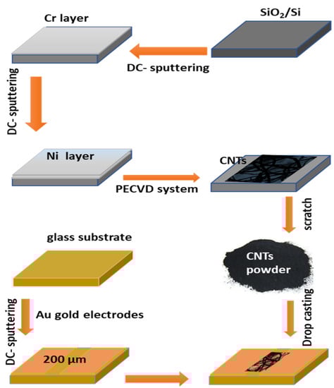 Figure 1 illustrates the steps for the synthesis of the CNTs and the gas sensing device. The CNTs were grown on the Si/SiO2 substrate. At first, the substrate was cleaned by deionized water, followed by ethanol, and drying in air. The substrate was coated with a Cr layer of ~5 nm and followed by a Ni catalyst layer of 18 nm, which was deposited using DC-sputtering. The substrate was then processed to grow CNTs by the PECVD method. The growth of CNTs was carried out using the system of the first-nano PECVD (3000-EasyTube-model). The carbon product obtained was carefully scratched for application in the characterization and sensing investigation.