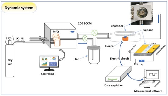 For fabricating the sensing device, two gold electrodes of ~200 µm were deposited on a glass substrate using DC sputtering, which was followed by scratched CNTs deposition (suspension in ethanol). Before the measurement, the sensor was dried at 60 °C for 30 min. in ambient air. The sensor was then tested using the gas sensing measurements system of model GSM-6000A. The system contains MFCs and a temperature-controlled Linkam chamber of model Linkam HFS600E-PB4 probe with a thermal stage of temperature accuracy of 0.1 °C, as shown in Figure 2. For examining the sensing performance, the sensor resistance was attained for the baseline in the airflow. The ethylene was passing in the sensing chamber with dry air at a flow rate of 200 mL/min. with a pressure of 1.0 atom. To keep the signal style, the sensor was exposed to the gas for ~200 s and then left to recover to the baseline for ~ 200 s. However, in some cases, the sensor may need more time to reach equilibrium. The measurements were performed using data acquisition (Keithley-2010, SweepMe 1.5.5 software). The sensing measurements were then carried out at various working temperatures that started from 30 °C up to 100 °C.