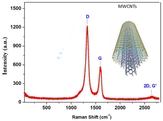Raman analysis provides important information regarding the structure throughout the degree of crystallinity and disordering of the fabricated materials. The Raman spectrum qualitatively observed the defects inside the CNTs. The Raman spectrum of the fabricated CNTs was measured in the wavenumber range of 100–2800 cm−1 through a He-Ne laser of 633 nm, as shown in Figure 4. Three modes were detected in the Raman spectrum, in which the peaks were assigned to D-, G-, and G’-bands corresponding to 1330, 1595, and 1645 cm−1, respectively [26]. The intensity of the D-band was ascribed to the high defective points, where the ratio in the intensity of D/G peaks is approximately 2.1, which refers to defect-induced CNTs [27]. The observed bands describe the stretching vibrations of C-C bonds. The G-band is ascribed to the in-plane bond of stretching motion of Sp2 pairs hybridized carbons and assigned to the symmetry of E2g. The D-band describes the breathing mode of A1g symmetry due to the disordering [28]. The G’-band provides information regarding the different interactions of the graphite interlayers in the depth of CNTs. The intensity ratio of G’- to G-band (G’/G = 0.17) indicates the multilayer formation of CNTs [29,30,31].