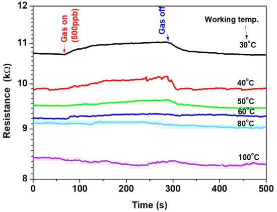 Figure 5. The sensor signal at various working temperatures of 30–100 °C.