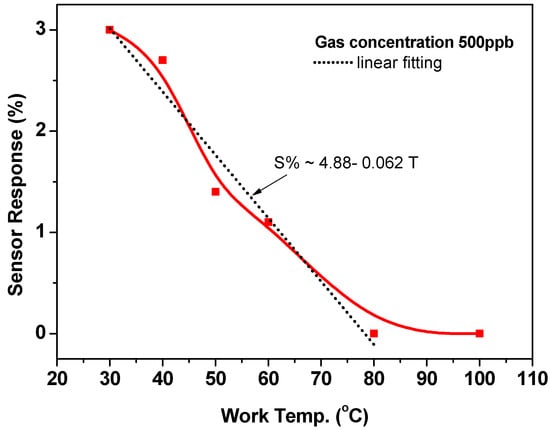 where Ra and Rg are the sensor resistances in air and air including gas, respectively. The response/sensitivity calculated at 30 °C is about 3%, corresponding to a low gas concentration of 500 ppb. This response gradually decreased to 2.8, 1.5, 1.0, 0.7, and 0.0% with increasing the working temperature to 40, 50, 60, 70, 80, and 100 °C, respectively. The empirical equation (S% = 4.88 − 0.062 T, where T in Celsius (°C)) formulated this decrease in the sensor response. The reduction in the sensor response at high temperatures may be explained in light of the results that were observed by Albesa et al. for the adsorption isothermal for ethylene on the CNTs [32]. In their study, the adsorption isotherms for ethylene on homogeneous nanotube were studied at 153, 273, and 343 K. They observed that the initial adsorption started at very low pressures and occurred on the interior sites of the CNTs. They found that, at 153 K, the adsorption curve displayed a sub-step at an average number of adsorbed molecules of 200. It was ascribed to the achievement of the first layer of ethylene molecules on the outer surface of CNTs. They also studied the effect of temperature on the simulated isotherms for ethylene that corresponds to the subsequent filling of the adsorption sites. The results concluded that, for all three temperatures, the density of the adsorbed phase in the internal sites of CNTs remained the same, while it was not the situation for the external sites. A disorder was observed for a gas molecule layer at the exterior surface of CNTs and it increased at high temperatures. Thus, their results are in agreement with the present sensing data, where it is expected that the adsorption of ethylene molecules will be much less at high temperatures.