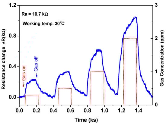 The sensor was also investigated at various gas concentrations to understand its performance and demonstrate the calibration curve. This study was carried out at the most sensitive temperature of 30 °C. Figure 7 shows the resistance change (ΔR) of the device versus time as a function of gas concentration. The signal was recorded at the various gas concentrations of 300, 500, 1000, and 2000 ppb in sequence. The sensor signals increased with an increase of the gas concentration and exhibited a quick response/recovery towards the gas on/off.