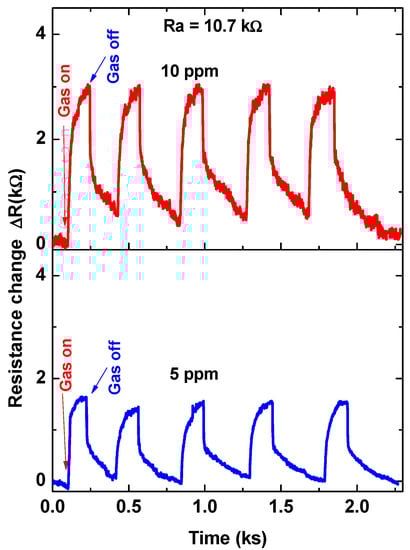 Figure 8. Five cycles of sensor signal at a working temperature of 30 °C for 5 ppm and 10 ppm.