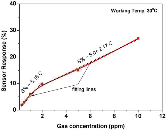 Figure 9. Sensor response as a function of gas concertation at a working temperature of 30 °C.