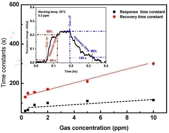 The response and recovery time constants are very important parameters for describing the features of the sensor. These constants are defined as the time taken for resistance to reach 90% of its equilibrium (response/recovery), as demonstrated in the inset of Figure 10. The response and recovery times are calculated as a function of the gas concentration for the signal that is reported in Figure 7 and Figure 8. The response time constant (black mark) is about 60 s at a gas concentration of 0.3 ppm and it increased up to ~110 s at 10 ppm, as plotted in Figure 10. The recovery time constant (red mark) is ~120 s at a low concertation of 0.3 ppm and it increased linearly with an increasing the gas concentration. The response and recovery of the sensor are fast and reasonable.