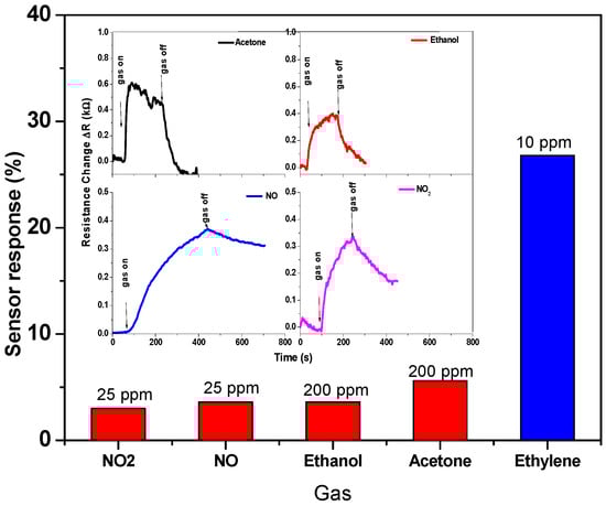 Figure 12. Sensor response toward various gases, such as NO2, NO, ethanol, acetone, and ethylene. The inset shows the sensor signal toward these gases.