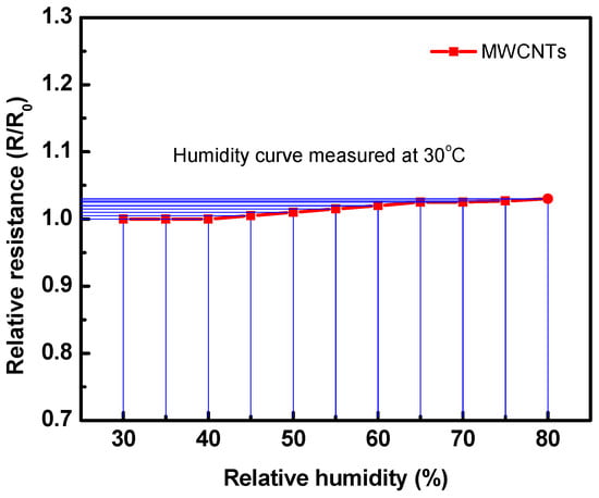 The effect of humidity on the performance of the fabricated gas sensor is applied by subjecting it to different humidity levels using a controlled humidity chamber (Humidity Series, Sheldon Manufacturing, Inc.). Figure 13 presents the effect of humidity conditions on the resistance of the fabricated sensor. Upon exposure to the humidity, the sensor resistance did not change until 50% humidity; however, it slightly increased with higher humidity. It was found that the maximum relative resistance change at 80% RH is about 0.02, which can be neglected. The results confirm that the present sensor can work well at various levels of humidity conditions.