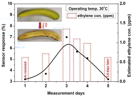 The device was tested to monitor the natural ripening of banana fruits in order to investigate the ability of the present sensor for monitoring the fruit quality. Xiao et al. reported a considerable study of ripeness controls by the ethylene production of natural ripeness of banana, 1-MCP-delayed, and ethylene-induced ripening [1]. They observed that the produced ethylene in natural ripening increased significantly after the 15th day of banana storage, attained the maximum level on day 18, and it then gradually reduced. Based on Xiao’s study, we have used a similar strategy as a guide for testing our device with banana natural ripening with ethylene production. Thus, a green-yellowish banana was brought as fresh fruit from the market. The ripeness of the banana over five days was detected by monitoring its produced ethylene. The measurements were carried out by placing the banana inside the glass jar, and then the synthetic air was flow at 200 SCCM through the jar to the sensing measurement chamber. The elapsed time from placing the banana to flow the air through the jar was approximately 5 min. to collect more gas from the banana. Figure 14 shows the estimated sensor response of the present device as a function of the ripening days at a working temperature of 30 °C. The sensor response of the green banana is about 2.8% on the first day of measurement. This response increased up to 7% on the third day, where the banana becomes mostly yellowish, and the ethylene emits at its highest level. With continued measurement for the fourth and fifth day, the dark spots started to cover the banana, and the sensor response decreases to the level of the first day. According to the data that were obtained in Figure 9, the equivalent ethylene concentration that is deduced from the sensor response during the banana ripening measurement can be estimated by the equation obtained from the first fitting line (S% = 5.18% C, where C is the gas concentration in ppm). The estimated ethylene concentration is presented as a histogram of the right side of Figure 14. These results are in agreement with the results presented by Xiao, confirming the ability of the present sensor to be integrated as a device for monitoring food quality.
