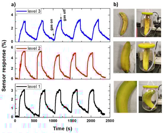 We also performed cycling on a CNTs-based sensor to investigate the repeatability of the fabricated sensor, as shown in Figure 15. Figure 15a shows the response changes of the CNTs-based sensor as a function of time when the sensor was exposed to five cycles of a sequence of air, including produced ethylene (response for 180 s) and dry air (recovery for 300 s), according to three bananas with a different level of ripening, as shown in Figure 15b. It was found that the sensor has a good sensing performance during the sensing cycles without sensing decay, which suggests that the sensing characteristics were repeatable. Moreover, it is sensitive to various levels of banana ripening.