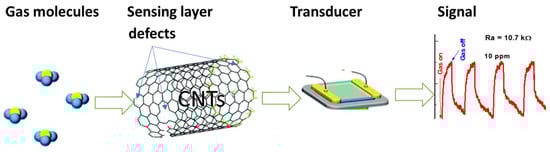 CNTs chemiresistor sensors have been widely studied due to their sensitivity to many gases, operation at room temperature, and extremely low detection advantage [8,16,17,18,19]. So far, there are open questions regarding the basic mechanism of CNTs sensing. It is known that the main gas sensing mechanism for a sensor that is composed of carbon nanotubes depends on the change in the concentration of the charge carriers in the nanotubes. There are two possible mechanisms: the variations of Schottky barriers at the contact points between the carbon nanotubes and metal electrodes, and the charge transfer due to the adsorption of gas molecules onto the carbon nanotubes surface.
