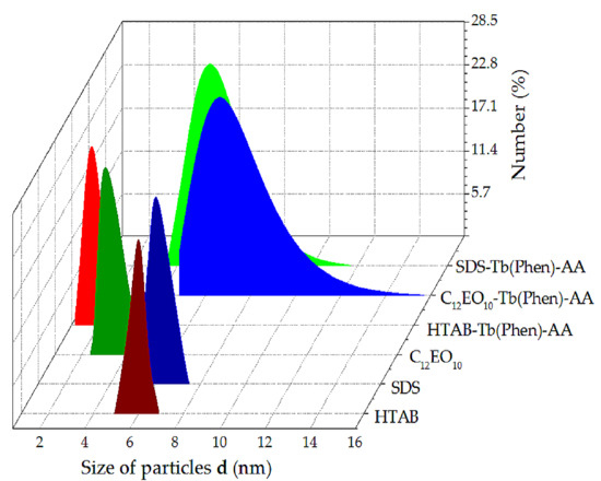 | Surfactant | Working Concentration Сsurf, mol·L−1 | CMC, mol·L−1 | d, nm | Tb(Phen)-AA Complex Diameter, nm |