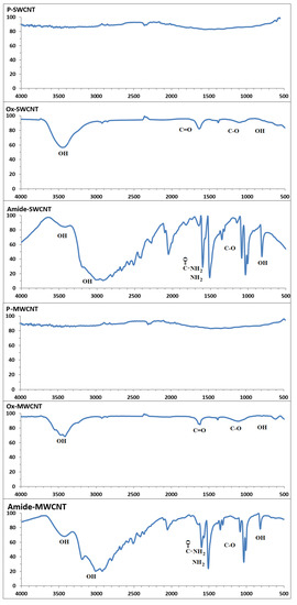The CNTs were functionalized using different functional groups (hydroxyl (OH), carbonyl (C=O), ether (C-O), and amine (NH2)). A distinct 1730 cm−1 peak, 3429 cm−1 broad band, and 1380–1430 cm−1 are attributed to the presence of carbonyl, OH-stretching vibration, and OH bending vibrations, respectively. In the amide spectrum, a new, strong broad band at 3200–3500 cm−1 can be assigned to the N-H, NH2, and OH stretching modes. The carbonyl band in the amide spectrum is shifted to 1600 cm−1 compared with 1700 cm−1 in the oxidized spectrum because of amide linkage formation. The other peak at approximately 1510 cm−1 is due to the NH2 scissoring mode. These observations are strong evidence for the introduction of a functional group on the CNTs [45,51,52].