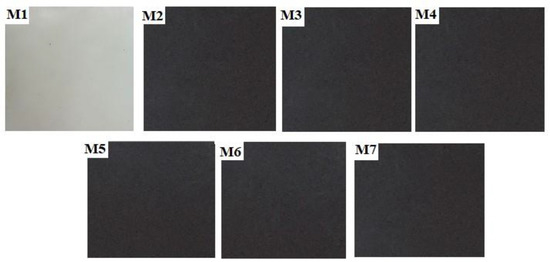 Digital images of the prepared nanocomposites sheets of HDPE/CNTs samples (M1–M7).