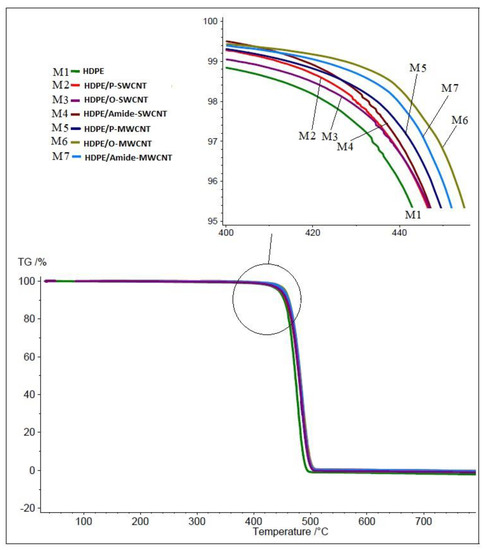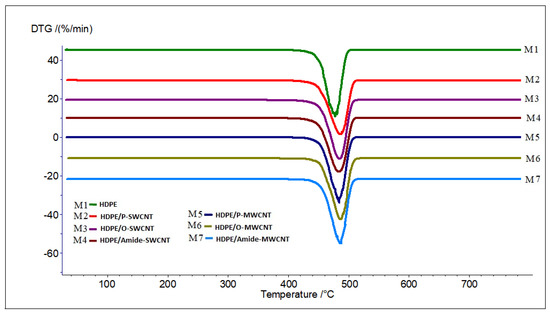 The TGA and the DTG degradation graphs for the prepared sheets are shown in Figure 3 and Figure 4, respectively. The onset decomposition temperature (T95); the temperature at which 5% weight loss of the sample occurs, the degradation temperature (Ton); the first derivative of the TG curve, and the residue content (Summarized in Table 2), were taken to describe the thermal stability of the prepared nanocomposites. The T95 and Ton for all nanocomposites sheets were higher than that of pure HDPE, indicating an improvement in the nanocomposites’ thermal stability by 4–12 °C and 2.8–6.7 °C for T95 and Ton, respectively. The T95 for the pure HDPE sheet was approximately 444 °C. This thermal stability improvement can be attributed to the addition of CNTs, as they exfoliate between the polymer chains and retard their mobility, making them more thermally stable with a higher T95 [44,53]. The residue content was in the range 1.13–1.77% which is acceptable values and close to the added % of the CNT (1%).