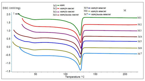 The DSC heating thermograms for the nanocomposite sheets M1–M7 measured with heating rate of 10 °C/ min from 25 °C to 220 °C, under nitrogen atmosphere.
