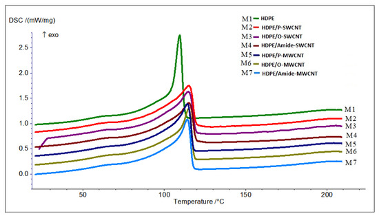 Seven sheets were produced by using six types of CNTs: P-SWCNT, P-MWCNT, O-SWCNT, O-MWCNT, amide-SWCNT, and amide-MWCNT. All prepared nanocomposite sheets contained 1 wt.% of CNTs. In addition, pure HDPE was prepared and used as a reference. The seven samples are named M1–M7, as shown in Table 1.