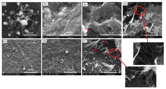 Scanning electron microscope images of (M1–M7) showing the embedding of CNTs in the polymeric matrix.