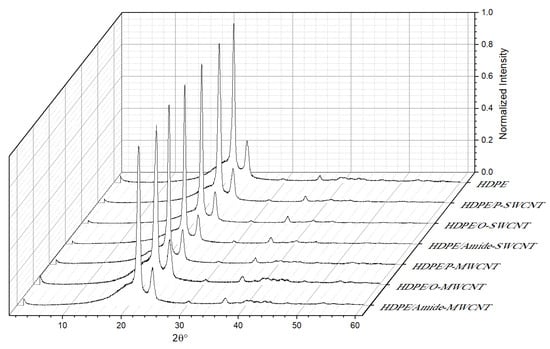 The two crystalline characteristic peaks (110) and (200) remain unchanged after the incorporation of the CNTs. However, for the prepared nanocomposites sheets, there are distinct changes in the intensities (Figure 8) of the two crystalline characteristic peaks (110) and (200), with O-MWCNTs producing the highest effect and amide-MWCNNT showing the lowest effect. These results are in good agreement with the DSC results. There were no characteristic peaks for CNTs, indicating that the CNTs are exfoliated in the HDPE polymer matrix, confirming the SEM results [66].