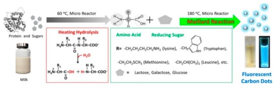 Schematic illustration of the step-by-step preparation of N-CQDs using expired milk as a source of carbon and nitrogen, showing also intermediate products of the hydrolysis of proteins and Maillard reactions. Reprinted from Ref. [56].