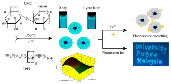 According to the literature, ferric ions have been the most commonly detected ions using CQDs as a fluorescent nanoprobe [2]. The main reason of this common phenomenon is due to the presence of the amino, carboxyl, and hydroxyl functional groups on the surface, which could interact with the Fe3+ easily and effectively, resulting in fluorescence quenching. It is well known that ferric ions exist in the biological systems and in the environment, but the excessive exposure to these ions could induce severe disease, such as kidney failure, liver damage, etc. [86]. Therefore, efficient methods for the monitoring of Fe3+ in biofluids and the environment could be useful for analytical practice. The novel CQDs-based sensors for the detection of Fe3+ ions are listed in Table 3. A report by Issa et al. [86] includes preparation of the N-CQDs from carboxymethylcellulose (CMC) and polyethyleneimine (LPEI) by hydrothermal synthesis at 260 °C for 2 h (Figure 3).