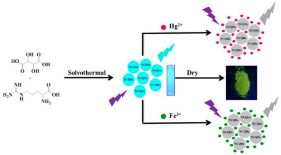 Schematic illustration of the preparation of N-CQDs using tartaric acid and L-arginine by a solvothermal method for dual sensing of Hg2+ and Fe3+ metal ions. Reprinted with permission from Ref. [100]. Copyright 2020 Elsevier.