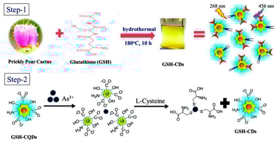 Moreover, the determination of aluminum (Al3+) in biological and environmental systems is of a great importance as it could significantly affect the quality of living and human health. Hence, in the study of Yu et al. [119], the preparation of N-CQDs for the Al3+ and quercetin (QT) detection was reported. The N-CQDs were fabricated by a facile hydrothermal procedure using a natural carbon source, osmanthus fragrans. The hydrothermal synthesis was carried out in a Teflon-lined autoclave at 180 °C for 10 h. The obtained N-CQDs exhibited a high quantum yield of QY = 21.9% (quinine sulfate was used as a reference standard), strong fluorescence, and water solubility. An interesting observation was made regarding the affinity of N-CQDs toward binding quercetin and/or Al3+ ions. Due to the presence of a π-bonding conjugated system and strong coordination of oxygen (O) atoms, quercetin could interact with Al3+ ions to form a QT–Al3+ complex. This means that the N-CQDs/QT system could be used for the detection of Al3+ ions. As QT was introduced to N-CQDs solution, fluorescence quenching was observed. The sensing mechanism related to quercetin detection was proposed, and it was concluded that an inner filter effect (IFE) and static quenching effect are responsible for the fluorescence behavior of the N-CQDs-QT system, as zeta-potential measurements indicated that no complexation could occur (the zeta potential of N-CQDs aqueous solution was determined to be −6.18 mV, and that of QT was −10.8 mV). The addition of Al3+ ions caused the fluorescence recovery of the N-CQDs/QT system, while no changes in the fluorescence emission intensity were observed when Al3+ was added to the N-CQDs solution. Using the N-CQDs/QT system, a linear concentration range of Al3+ was determined from 0.1 to 100 µM, with an estimated LOD = 26 nM. The sensing of Al3+ was evaluated in real system analysis, human serum, and living cells. The obtained RSD results less than 3.4% indicated good accuracy and method precision with potential application in dual sensing of quercetin and Al3+, especially in the biomedical field. The detection of arsenic (As3+) ions is of crucial importance for environmental analysis and water quality assessment. Long-term exposure to arsenic in drinking water can cause adverse health effects and threaten the public health and environment. A synthetic procedure of glutathione-passivated CQDs (GSH-CQDs) used for As3+ detection is shown in Figure 5, and it was reported by Radhakrishnan and Panneerselvam [120].