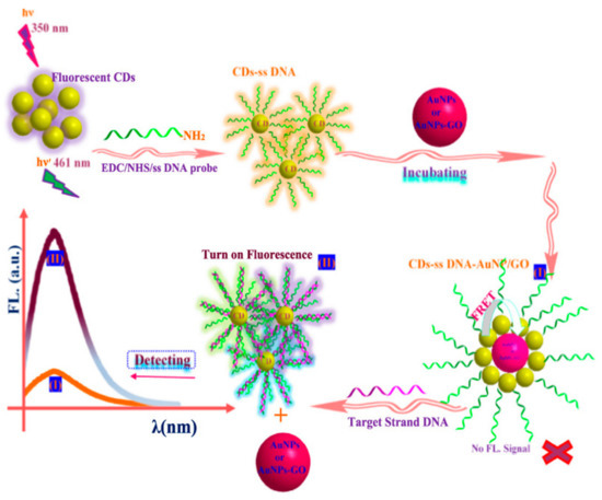 An interesting example for presenting versatile application of the CQDs as a biosensor is the detection of influenza A (H1N1) virus reported by Achadu et al. [48]. The sensing was based on the conjugation of specific antihuman influenza A monoclonal antibody to the sulfur-doped graphitic carbon nitride CQDs (S-gCNQDs) and Ag2S nanocrystals. The S-gCNQDs were prepared by solvothermal treatment of 4-amino-3-hydrazino-5-mercapto-1,2,4-triazole and citric acid dissolved in DMF, and the mixture was heated at 200 °C for 8 h. The final product was purified by filtration and dialysis (MWCO = 2 kDa) and then freeze dried for further use. The structural analysis confirmed quasi-spherical morphology of S-gCNQDs within the size range from 3 to 5 nm. When excited to the wavelength λEX = 400 nm, a strong green luminescence was emitted at λEM = 512 nm, and QY was estimated to QY = 33% in aqueous solution. Selective and sensitive sensing of H1N1 virus was performed using a designed nanocomplex comprised of antibody-conjugated S-gCNQDs and antibody-Ag2S nanocrystals. The linear range was observed within the concentration range from 10 fg/mL to 1 ng/mL, with R2 = 0.9872 and LOD = 5.5 fg/mL measured in deionized water. The sensor was also tested on the detection of H1N1 virus measured in human serum. The LOD was estimated to be 8.5 fg/mL in human serum. In order to detect clinically isolated virus of influenza A (H3N2), the S-gCNQDs were modified with H3N2 monoclonal antibody in the presence of antibody-Ag2S nanocrystals to form a nanosandwich complex. It was concluded that the biosensor demonstrated high sensitivity and selectivity toward the target virus and presented potential application in rapid sensing of very infectious diseases. Interestingly, there are few reports of the potential use of carbon dots in antiviral therapy and also for biosensing purposes, including biosensing of HIV DNA sequences [138,139]. A FRET-based DNA biosensor using single-stranded DNA (ss-DNA) functionalized CQDs as the energy donor and gold nanoparticles (AuNPs), AuNPs/graphene oxide (GO), as efficient quenchers demonstrated the efficiency down to the femtomolar level for the detection of HIV DNA (Figure 6). The detection limit for the HIV DNA method was estimated to be LOD = 15 fM. The method was evaluated for the analysis of real samples, in this case for the detection of HIV DNA in human serum, and it was concluded that immunoassay could be used for the efficient sensing of HIV in human serum. It is also suggested that this type of immunoassay could be also investigated for the detection of viral RNAs. As it can be noticed, there are some examples of the CQDs application in viral biosensing that could be of a great importance for the theranostic purpose. Most recently, the ongoing global pandemic of SARS-CoV-2 (coronavirus disease, COVID-19) has become the greatest challenge to modern science. It is well known that early, rapid, low-cost, and accurate diagnosis of SARS-CoV-2 is of great importance in order to prevent further spreading of the virus. Although there have not yet been any studies reported of using pristine or modified CQDs as a viral therapy to combat or for the detection of COVID-19, the above-reported examples are undoubtedly showing that carbon dots have a great potential for theranostic application against SARS-CoV-2 [138].