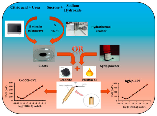 Furthermore, Mittal et al. [42] used a solvothermal “bottom–up” approach for CQDs synthesis by using citric acid as a carbon precursor. The obtained CQDs were incorporated in a polypyrrole matrix by their dispersion during the in situ polymerization of pyrrole. The obtained CQD–polypyrrole composite was used as a supercapacitor electrode material. The electrochemical properties of the CQD–polypyrrole composite were studied with cyclic voltammetry and galvanostatic charge–discharge studies. Cyclic voltammetry has shown that the incorporation of CQDs in a polypyrrole matrix has enhanced the electrochemical properties of polypyrrole. The composite had 33% higher specific capacitance compared to neat polypyrrole, which can be explained with the interfacial charge transfer between CQDs and the polypyrrole matrix. Moreover, citric acid and urea were used for obtaining N-CQDs by microwave-assisted synthesis, while second CQDs were prepared by hydrothermal treatment of the mixture of sucrose and NaOH in the study reported by Fares et al. [169]. The schematic illustration of the bare CQDs and CQDs/CPE preparation is shown in Figure 7. The N-CQDs obtained with the microwave-assisted method had a smaller particle size (less than 10 nm) and higher monodispersity with no apparent by-products compared to hydrothermally obtained CQDs, and therefore, N-CQDs were used for bare carbon paste electrode modification.