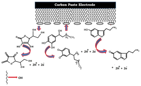 The modified electrode was used for the potentiometric determination of tobramycin sulfate (TOBRA) in pharmaceutical formulation and spiked human plasma. It was determined that the addition of CQDs in carbon paste has significantly improved the performance of the electrode (LOD was 3.2 nM, linear dynamic response was in a wide concentration range from 10−8 M to 10−2 M and the electrode selectivity was improved). A design of a CQDs-modified carbon paste electrode sensor for the selective detection of the hormone adrenaline was proposed by Sharath Shankar et al. [172]. Carbon soot was used as a carbon precursor in CQDs synthesis. The obtained CQDs were used to modify carbon paste electrode (CPE). The obtained CQDs/CPE sensor was used for the determination of adrenaline (AD). The sensing mechanism was suggested based on the presence of the hydroxyl groups on the CQDs surface. It is known that adrenaline exists in the cationic form, and electrostatic attraction between negatively charged hydroxyl groups and positively charged adrenaline could produce a redox current (Figure 8). The sensor had a lower limit of detection of 6 nM, which showed that CQDs have increased the sensitivity of the sensor. The selectivity of the modified electrode was also improved, since the simultaneous determination of adrenaline (AD), ascorbic acid (AA), and serotonin (5-HT) were enabled, as the overlapping peaks on the carbon paste electrode were resolved to three peaks on the modified CQDs/CPE. The adrenaline concentration was also determined in real samples (injection sample of adrenaline bitartrate). Wei et al. [173] performed a microwave-assisted synthesis of CQDs by using glucose as a precursor. The obtained CQDs were used for glassy carbon electrode modification with electropolymerization (20 cycles, ν = 50 mV/s, potential range from −1.0 to 2.0 V). The obtained sensor was used for the determination of ascorbic acid (AA), and it was investigated by cyclic voltammetry (CV), electrochemical impedance spectroscopy (EIS), and differential pulse voltammetry (DPV). It was determined that the sensor has two linear ranges (0.01–3 mM and 4–12 mM). A low limit of detection was determined as LOD = 10 mM. The high sensor sensitivity in both linear ranges was observed. In addition, the selectivity of the sensor was also satisfactory, which enabled the determination of AA in the presence of dopamine (DA) and uric acid (UA).