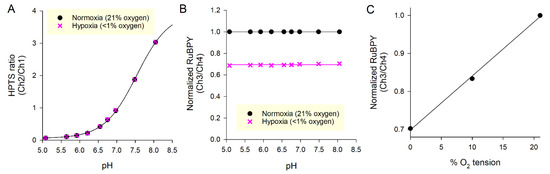 (A) The calibration curve for the HPTS ratio (Ch2/Ch1) in normoxic and hypoxic conditions. Best-fit to Equation (1) with constants listed in Table 1. (B) Hypoxia-sensitive ratio of isosbestic HPTS to RuBPY (as Ch3/Ch4). Hypoxia (<1% O2) reduces the Ch3/Ch4 ratio but is pH-insensitive. (C) Three-point calibration for 0.1%, 10%, and 21% O2.