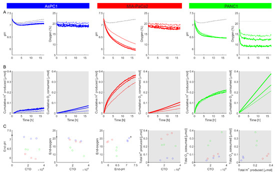 Metabolic profiling of PDAC cell lines. (A) Time courses of pH and O2 for AsPC1 (blue), MIA-PaCa2 (red), and PANC1 (green) plated at 30, 50, or 70k cells per well. Thicker lines denote higher cell density. Blank time courses were obtained from cell-free wells. Media were prepared using DMEM 5030 and contained 2 mM HEPES and 2 mM MES, 25 mM glucose, supplemented with 10% FBS, 1% penicillin–streptomycin mixture. (B) Cumulative H+ production and O2 consumption, calculated using Equations (7) and (8). (C) Data from a and b replotted as a function of cell number, measured by CTO fluorescence. Plots with white background relate to end-point pH and O2, and plots with gray background relate to cumulative H+ production and O2 consumption. The black star symbol denotes data from cell-free wells. Plots represent a mean of 3 biological repeats.