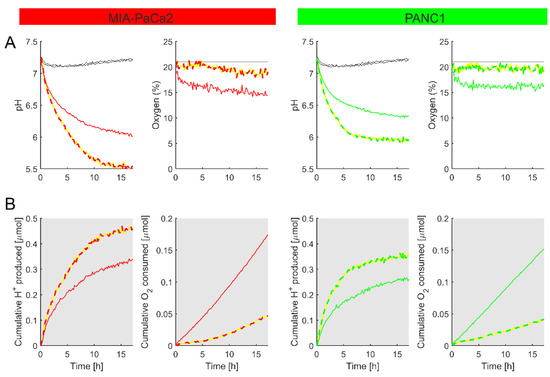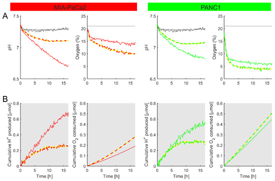 Using the method to study the effect of metabolic inhibitors. (A) Time courses of pH and O2 for MIA-PaCa2 (red) and PANC1 (green) plated at 70k cells per well. The metabolic substrate was glucose throughout. Media contained 2 mM HEPES and 2 mM MES, 25 mM glucose, supplemented with 10% FBS, 1% penicillin–streptomycin mixture, 1% GlutaMAX, and 1% sodium pyruvate. Thick dashed lines indicate the effect of 10 µM rotenone. (B) The cumulative H+ production and O2 consumption, calculated using Equations (7) and (8). Plots represent a mean of 3 biological repeats.
