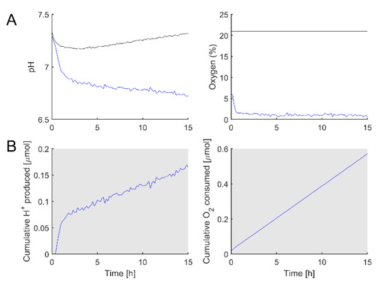 Using the method to study metabolism in primary myocytes freshly isolated from the mouse ventricle. (A) Time courses of pH and O2. A suspension of myocytes in media was probed for O2 and pH over a period of 15 h, shortly after enzymic isolation from a mouse heart. Media contained 2 mM HEPES and 2 mM MES, 25 mM glucose, supplemented with 10% FBS, 1% penicillin–streptomycin mixture, 1% GlutaMAX, and 1% sodium pyruvate. (B) The cumulative H+ production and O2 consumption, calculated using Equations (7) and (8). Myocytes have a high oxidative metabolism, causing the rapid depletion of O2. Some degree of glycolytic metabolism was also noted. Mean of 3 technical repeats.