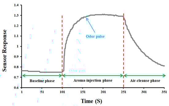 The process of data acquisition, derived from the MAU-9 e-nose system, was divided into three phases including baseline establishment, sample air aroma injection and purification with a total run time of 350 s. The responses of the nine MOS sensors were recorded and graphed based on voltage variation (∆V) vs. time. The details of run parameters and procedures for the data-acquisition phases of this e-nose system are given in the following subsections.