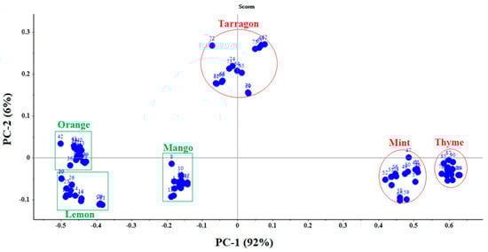 The score diagram demonstrates the predicted positions of principal components (PCs), found among VOC emissions of each sample type and statistically determined via PCA from e-nose output values from analysis of essential oil volatiles. Depending on the position of each group in the score diagram (position with positive or negative values on the 4-quadrat chart), it is possible to assign specific PC values for all sample types. The PCA results of six essential oil sample types are presented in Figure 3, based on sensor responses. The first and second PCs accounted for 92% and 6% of the total sample variance, respectively. The sum of the first two PCs represents 98% of the total sample variance, presenting sufficient information for explaining differences in the aromas of essential oils. There is a clear difference between samples of essential oils of medicinal plants and essential oils of fruits. Based on the location and spatial distribution of data clusters (represented by each sample type), samples of fruit essential oils (left) were well differentiated (spatially separated) from samples of medicinal plants (right), indicating significant differences in chemical composition of VOCs from these two groups based on their corresponding volatile EO analytes. The relatively tight data clusters, derived from multiple sample replications of each sample type, indicate that instrument precision was good for all six types of EO sample analytes. The effective repeatability of sensor-array output values for each sample type provided an indication that the MAU-9 sensor array was consistently responsive to headspace VOC emissions from both herbal and fruit essential oils.