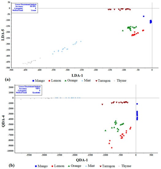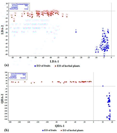 Classification of essential oils from edible plants. Comparison of methods: (a) LDA and (b) QDA methods.