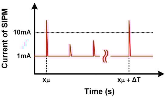 Radiation detection systems manufactured in previous studies with SiPM boast a high performance but have a fatal drawback of low portability [3,4]. This is because SiPM-based high-performance radiation detectors require a high driving voltage. Therefore, if a power conversion circuit optimized for the charge generation characteristics of the SiPM is applied, the portability of the radiation detection system may be increased. However, an SiPM has problems that are difficult to optimize with the conventional power conversion circuits due to its unique electrical characteristics. First, according to the commercial product [5], a driving voltage of more than 25.5 V is required. In other words, it can be seen that a step-up DC–DC converter should be designed to receive the voltage of a Li-ion battery (3.7 V) and generate a high voltage that is nearly eight times higher. Second, as shown in Figure 2, it shows a low power characteristic of at least 1 mA in normal mode. However, when radiation particles are injected, a maximum current of 20 mA can flow for several hundred ns. Therefore, the step-up converter for the SiPM should be able to achieve high efficiency by ensuring optimized operation for the current characteristics in Figure 2.