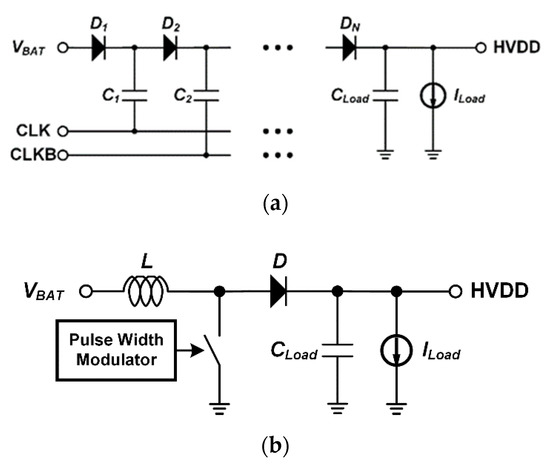 In general, a step-up DC–DC converter can be implemented with the topology of an SC (Switched Capacitor)-based charge pump or an SI (Switched Inductor)-based boost converter [6,7] as shown in Figure 3. First, the charge pump has the advantage of being able to achieve a high conversion ratio with a relatively simple method by connecting several capacitor (CN) and diode (DN) stages in series, but it is difficult to achieve a high conversion ratio under load conditions of several tens of mW or more. Otherwise, there may be disadvantages of lowering the efficiency. Second, the boost converter shows high efficiency even under a load condition of several hundred mW or more. It consists of an inductor (L), diode (D), and a switch controlled by a pulse width modulator. However, it has a disadvantage because it is difficult to expect a fast transient response in a low-power application. In this work, a boost converter was selected to achieve a high conversion ratio. In addition, a circuit for operation optimized for the current characteristics of SiPM was proposed to achieve fast transient response characteristics.