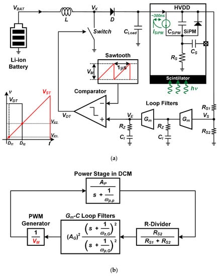 As described above, a switched inductor-based boost converter was selected as the basic topology for driving the SiPM. Figure 4a shows the basic configuration of a voltage-mode boost converter to generate a voltage from 3.7 to 25.5 V. First, the power stage composed of an inductor (L), a Schottky diode (D), and switch plays a role in generating output voltage by pulse width modulation (PWM) signal. Considering that the output voltage is 25.5 V and is controlled in discrete continuous mode (DCM), it is composed of an asynchronous-type topology that freewheels the build-up current with a Schottky diode. Second, the PWM controller, which consists of a voltage divider (RS1, RS2), loop filters (Gm, RZ, CI), and comparator, can generate a duty signal (VDT) proportional to the output voltage drop. When radiation particles enter the SiPM, a radiation-induced charge is generated. Additionally, a voltage drop proportional to the amount of charge is generated at the output stage. The voltage divider scales down the voltage drop at the output, and the compensator implemented as a Gm-C loop filter integrates this error voltage (VE). Additionally, the comparator generates VDT by comparing VE and sawtooth waveform. Finally, the VDT controls the switch of the power stage to fill the voltage drop of the output stage. Figure 4b shows a small signal model of a voltage-mode boost converter. In DCM, there is one pole (ωp,p) in the power stage, and the poles (ωp,G) and zeros (ωz,G) of the loop filters determine the loop stability.