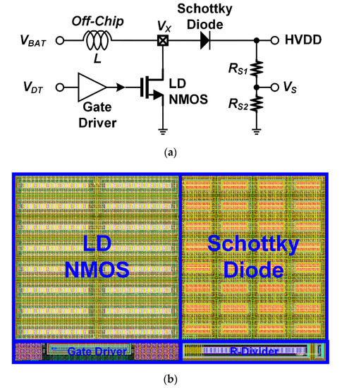 The power stage was composed of an inductor, a power switch, and a diode, as shown in Figure 7a. The inductor was modeled with 10 µH and DCR 700 mOhm, which are pure inductance values, and the parasitic capacitance considered in the actual inductor pad was 10 pF. Since the Vx node switches from ground to 27 V according to the operation of the power stage, n-type LDMOS (laterally diffused metal-oxide semiconductor) and Schottky diodes, each with a tolerance of up to 35 V, were used. The power switch was optimized and designed based on the averaged load current of 2 mA, and the inverter chain-based gate driver was designed to be fully turned on and off.