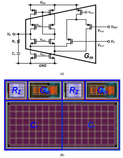 Figure 8 shows the loop filters that create an error voltage. The loop filter used in this study was made based on the folded cascode OTA, and two OTAs were cascaded to prevent the loop gain from being reduced by the voltage divider. In addition, a capacitor (Cx) calculated as a pole was connected to the output along with the transconductance value of OTA, and the resistor (Rz) inserted in series with this has the effect of inserting zero together with Cx. The power consumption of each OTA is 4 μW, and it is designed in an edge that does not reduce conversion efficiency.