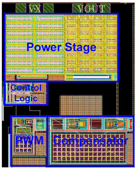 The overall layout diagram of the boost converter proposed in this study is shown in Figure 10. It can be seen that even though the QST circuit proposed in this study is added, it can be designed with a sufficiently small area (1.2 mm2).