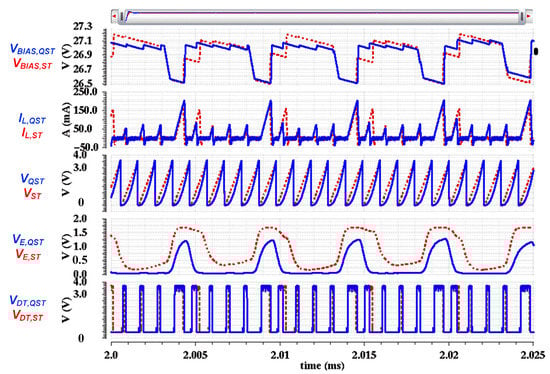 Figure 11 compares QST and CST in the boost converter based on the same voltage-mode PWM control. In brief, a load transient of 20 mA was generated every 5 µs. First, it can be seen that in the case of the prior CST, it takes two clocks until VBIAS is fully recovered. However, it was confirmed that the case applying QST succeeded in regulation immediately except for the moment of transition. It can be seen that these results are clearly verified by the waveform of VE. Unlike the case of CST, the range of change in VE is kept remarkably low.