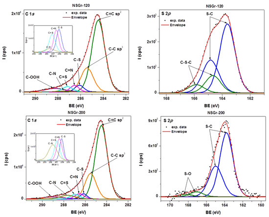 Through the deconvolution of the S 2p core-level spectrum of NSGr-120, two components were identified, indicating the presence of two types of bonding: S–C– (polysulfide with terminal S) at 163.6 eV and –C–S–C– (polysulfide with central S) at 164.6 eV [27,28]. The situation changed in the case of the NSGr-200 sample where the total amount of sulfur is much lower than in NSGr-120 sample. Two lines are also seen here, namely the polysulfide with terminal S at 163.8 eV and a sulfate position at 167.0 eV.