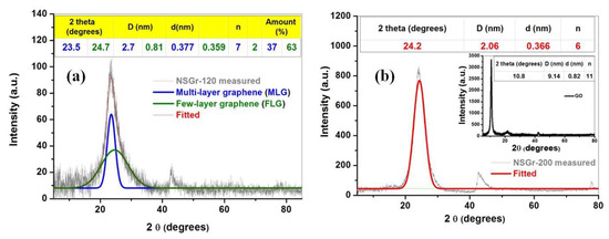 Next, the XRD patterns of the NSGr samples were recorded (Figure 5). Both display a broad peak centered at about 24°, corresponding to (002) reflections of graphene planes. Since the peak around 24° in the NSGr-120 sample is asymmetric, it was fitted by two theoretical Gaussian peaks. Sample NSGr-200 displayed only one peak at 2θ = 24.2°. The spacing between the graphene layers was calculated with the Bragg equation [30]: