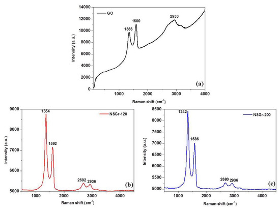 The degree of structural disorder within graphene oxide and nitrogen and sulfur co-doped graphene samples was evaluated using Raman spectroscopy (Figure 6). The high fluorescence signal of GO supports the fact that the material is highly oxidized, being in accordance with the XRD pattern. In the nitrogen and sulfur co-doped graphene samples, three important bands are evidenced: the defect (D) band at ~1350 cm−1, the graphite (G) band located at ~1590 cm−1, and the 2D band at ~2690 cm−1.