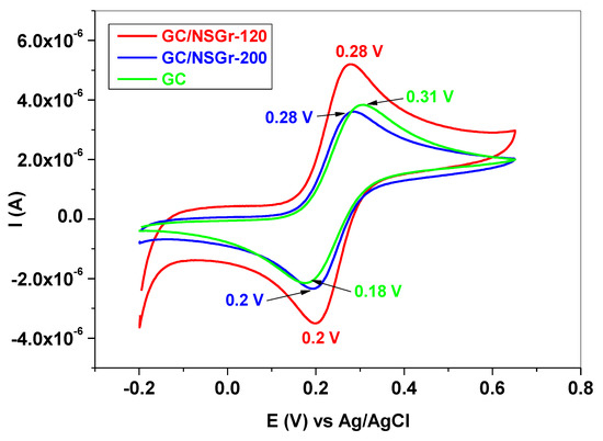 Cyclic voltammograms recorded with bare GC (green), GC/NSGr-200 (blue), and GC/NSGr-120 (red) electrodes. Electrolyte: 1 mM K4[Fe(CN)6] + 0.2 M KCl; scan rate: 10 mVs−1.
